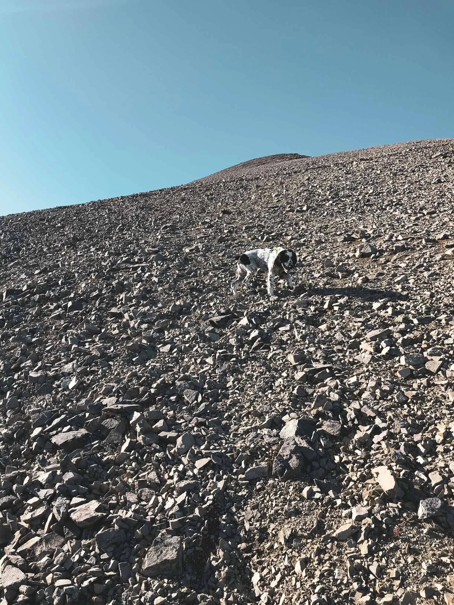 Some good stuff up high. Chose to put Charlies boots on him, to protect his paws from the scree.